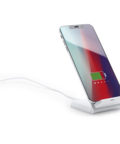 Drahtloses Ladegerät in elegantem Weiß, mit Smartphone-Halterungsfunktionalität. Mit Schnellladung, 10W-Funktion und kompatibel mit Geräten, die mit drahtloser Ladetechnologie ausgestattet sind. Großer Druckbereich und präsentiert in einer attraktiven, individuellen Design-Box.