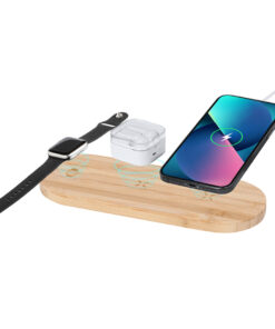 15W Wireless Multi-Ladegerät aus Bambus. Entwickelt für das gleichzeitige Laden von Smartphone, Kopfhörern und Smartwatch: eine vielseitige, All-in-One-Ladestation mit Ladeanzeigeleuchten auf der Rückseite.Materialien wie Bambus fördern die Nutzung natürlicher Rohstoffe und reduzieren so die Schadstoffemissionen. Es stammt von einer sehr widerstandsfähigen und vielseitigen Pflanze mit schnellem Wachstum und Regeneration, was es zu einer hervorragenden Alternative zur Verwendung von traditionellem Holz macht.Hergestellt gemäß RoHS-Standards und in Übereinstimmung mit den folgenden Sicherheitsanforderungen:Überhitzungsschutzsystem.Überladeschutzsystem.Sperrsystem zur Vermeidung von Kurzschlüssen.