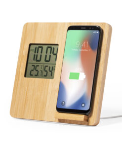 Linie „Natur“ Wetterstation mit integriertem kabellosen 10W-Ladegerät. Hergestellt aus poliertem Bambus, mit Thermometer- und Hygrometerfunktionen. Inklusive 1 m Micro-USB-Ladekabel und kompatibel mit Geräten, die mit kabelloser Ladetechnik ausgestattet sind. Die Uhr ist batteriebetrieben (Knopfzelle im Lieferumfang enthalten) und wird in einer attraktiven Ökodesign-Box geliefert. Gebrauchsanweisung in Englisch und Spanisch erhältlich.