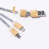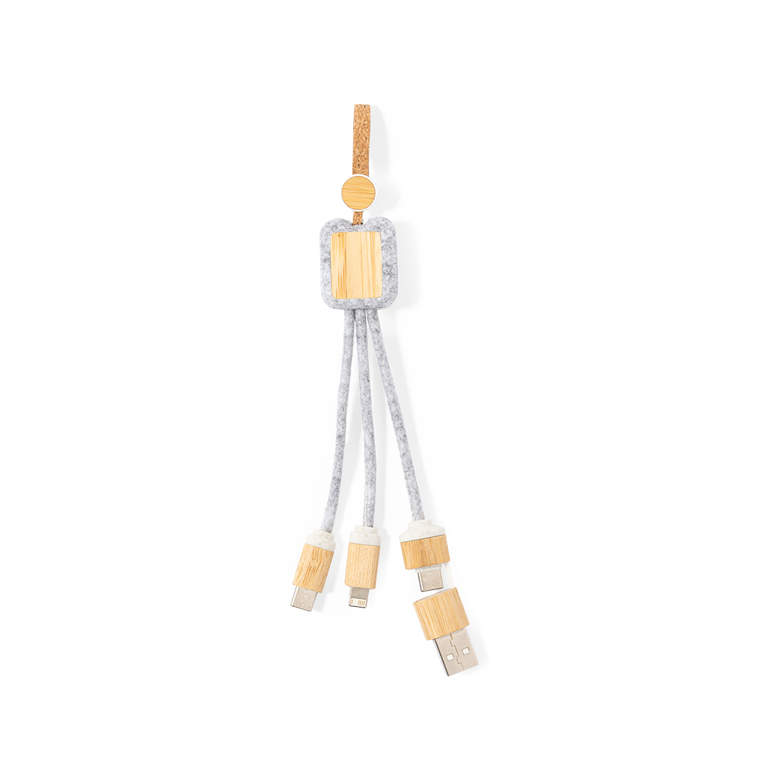 Ladekabel aus Bambus und RPET-Filz. Mit Typ-C- und USB-Eingangsanschlüssen und Typ-C-, Lightning- und Micro-USB-Ausgängen. 5V DC 2.4A. Präsentiert in individuellem, wiederverschließbarem Kraft-Design-Beutel mit Etikett.Der recycelte RPET-Filz ist das Ergebnis der Kombination des Recyclingprozesses von Kunststoffen mit der tausendjährigen Technik der Filzherstellung, was zu einem Öko-Trendmaterial führt, das nicht nur recycelt, sondern auch wiederverwertbar ist.