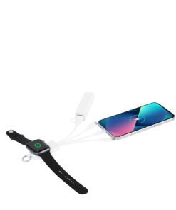 5-in-1 Ladegerät. Enthält drahtlose Ladeanschlüsse für Smartwatches (Android und iOS), Eingänge Typ C und USB sowie Ausgänge Typ C und doppelte Micro-USB- und Lightning-Anschlüsse.