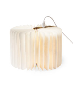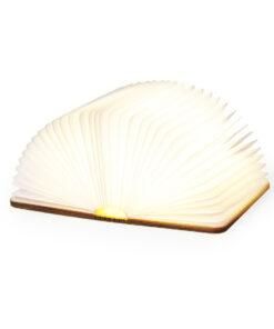 Echte tragbare LED-Lampe in Form eines Buches. Aus Holz, mit einem Innenraum, der Papierblätter simuliert, beleuchtet von 16 LEDs. Wiederaufladbar durch 700-mAh-Akku, inklusive USB-Ladekabel. Präsentiert in einer Kraft-Design-Box.