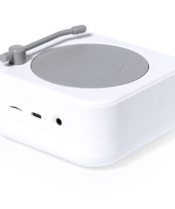 Bluetooth®-Lautsprecher in Form eines originellen Plattenspielers, kompakt und mit 5 W Leistung. 800-mAh-Lithium-Akku, inklusive Typ-C-Ladekabel und Ladestatusanzeige. Freisprechfunktion und FM-Radio, mit Steckplatz für Micro-SD-Karten mit bis zu 32 GB Kapazität und einem AUX-Eingang für 3,5-mm-Klinkenanschluss. Hergestellt aus widerstandsfähigem weißem ABS mit grauen Details und präsentiert in einer individuellen Kraft-Design-Box, mit Bedienungsanleitung in Englisch und Spanisch.