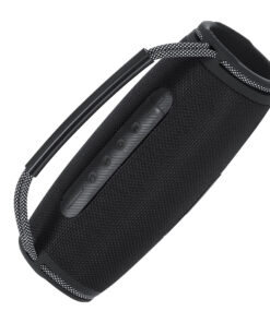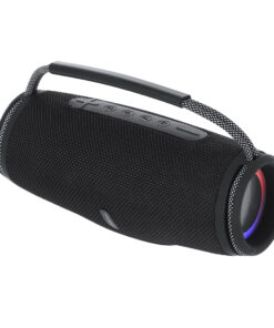 Stereo Bluetooth® Lautsprecher 2x5W mit mehrfarbigem Licht, hergestellt aus widerstandsfähigem Premium-Stoff. Er verfügt über einen zweifarbigen, geflochtenen Tragegriff mit weichem Silikongriff. Er enthält einen speziellen Seitenbereich für Druck. Mit mehrfarbigen LED-Lichtern, die 7 Beleuchtungsmodi bieten, Bluetooth 5.3 Konnektivität und einem integrierten Bedienfeld oben bietet er Freisprechfunktionalität, USB-Anschluss, Typ-C-Anschluss und einen Micro-SD-Kartenleser und FM-Radiofunktion.