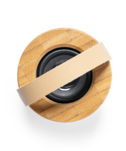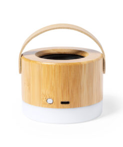 Kompakter Bluetooth®-Lautsprecher mit 3 W Leistung und LED-Licht. Aus Bambus und ABS, mit PU-Tragegurt. 300-mAh-Lithiumbatterie, inklusive Typ-C-Ladekabel. Präsentiert in einer individuellen Kraftpapier-Designbox, mit Bedienungsanleitung in Englisch und Spanisch.