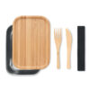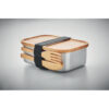Lunchbox aus Edelstahl. Deckel, Messer und Gabel aus Bambus. Inkl. Elastikbandhalter für das Besteck. Füllmenge: 600ml. Da Bambus ein natürliches Material ist, können Farbton und Maße pro Artikel variieren. Dies kann zu Abweichungen im Ergebnis der Veredlung führen.