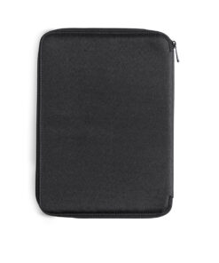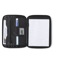 Elegante Dokumententasche mit Reißverschluss aus weicher Mikrofaser. Innenfach mit herausnehmbarem Block mit 20 linierten Blättern, Reißverschlusstasche, Pattentasche sowie Kartenfächern und Stifthalter. Mit elegantem Metall-Label auf der Front für den Laserdruck.