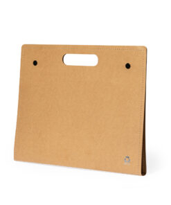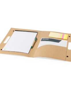 Ökologische Mappe mit zweifachem Druckknopfverschluss aus flexiblem Recyclingkarton und praktischem, integriertem Griff. Mit herausnehmbarem Block mit 25 linierten Blättern, 25 großen Haftnotizen und 125 Mini-Haftnotizen sowie Klappentasche und Kugelschreiberhalter.