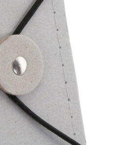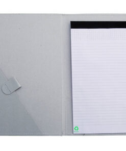 Mappe mit originellem Gummibandverschluss aus widerstandsfähigem Recyclingkarton mit Verstärkungsnähten. Mit Notizblock mit 20 linierten Blättern, dreieckiger Klappentasche und Stifthalter.