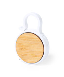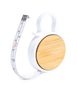 1-m-Flexometer aus widerstandsfähigem weißem ABS, mit Bambuseinsatz am Körper und Transportring. Mit breiter Brandingfläche und Klinge mit Messungen in Zentimetern und Zoll.