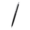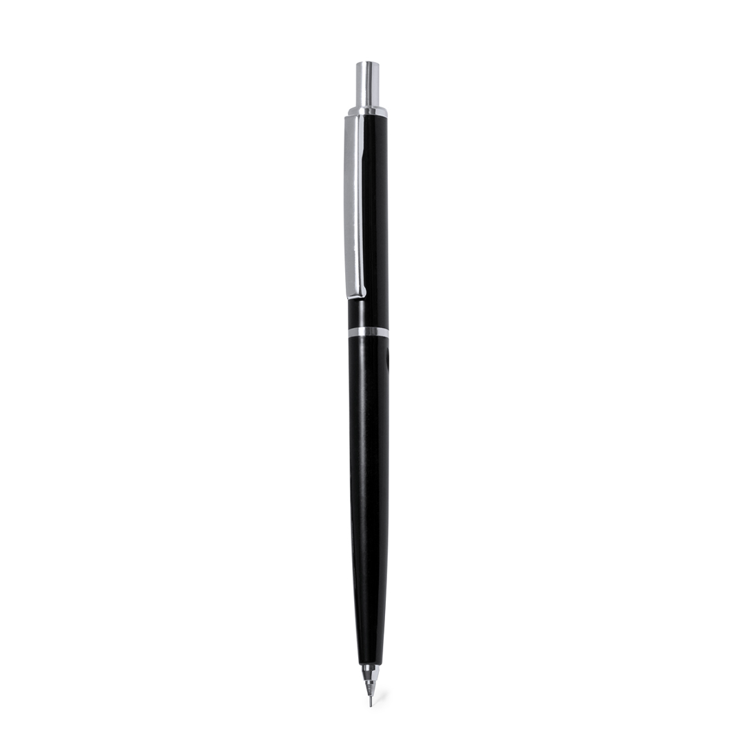 Stilvoller Druckbleistift aus robustem ABS. Schwarzer Schaft und passender glatter Griff, mit verchromtem Druckknopf, Clip, Spitze und Mittelring. Inklusive Radiergummi und 0,7 mm Minen.