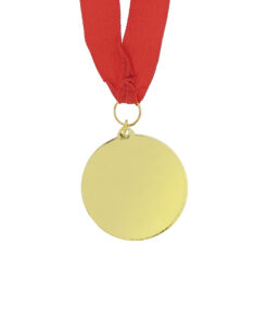 Metallmedaille mit goldener erhabener Oberfläche. Inklusive roter Polyesterbänder.