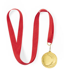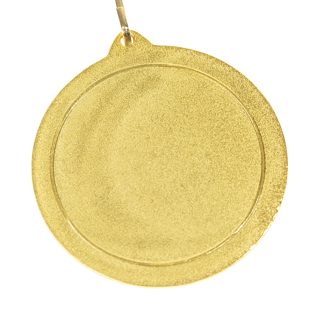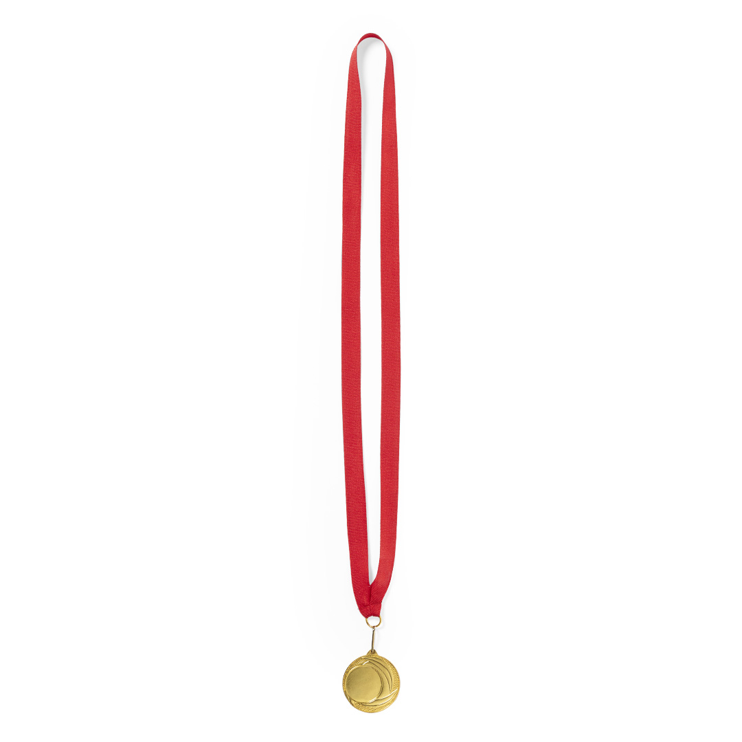 Goldgeprägte Metallmedaille. Mit rotem Polyesterband, passendem Metallkarabiner und speziell für die Lasergravur entworfen.