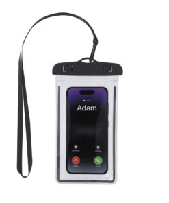 Wasserdichte Tasche aus PVC, entworfen mit Touch-Funktion für die einfache Nutzung von Geräten. Mit Sicherheitssystem und Klappverschluss für gute Dichtigkeit. Kompatibel mit Bildschirmen bis zu 6,7 Zoll. Enthält passendes Band und Karabiner für zusätzlichen Komfort.