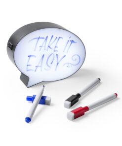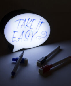 Lustige Dekolampe in Form einer Sprechblase. Mit 8 LEDs, ON/OFF-Taste und drei Markern in den Farben Blau, Schwarz und Rot – mit integriertem Radierer im Deckel. Batteriebetrieben – 3 x AAA nicht inklusive. Präsentiert in einer attraktiven Designbox.