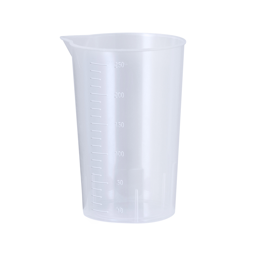 250 ml Messbecher aus widerstandsfähigem, transparentem PP. Mit seitlicher Anzeige in 10-ml-Segmenten und Ausgießer, um ein Verschütten zu verhindern.