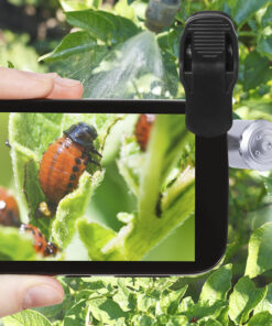 Mikroskop für Smartphones mit Befestigung an der Kamera durch Clip. Mit Kristallvergrößerungslinse mit bis zu 60-facher Vergrößerung, 2 LEDs und ultraviolettem Licht für ein außergewöhnliches Bild. Knopfzellen inklusive. Verpackt in einem eleganten Kunstleder-Etui und Stoffbeutel und präsentiert in einer attraktiven Designbox.