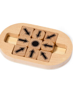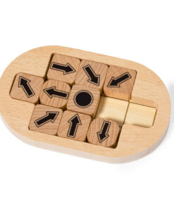 Geschicklichkeitsspiel aus Holz, bestehend aus 9 Teilen und einem Brett. Die Herausforderung besteht darin, die 8 Teile mit Pfeilen über das Spielbrett zu schieben und sie so anzuordnen, dass sie auf das mit einem Punkt markierte Teil zeigen, wobei Geschick und Strategie kombiniert werden. Einzeln präsentiert in einer Kraft-Design-Box.