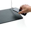 PU Mousepad mit integrierter Wireless-Charging Funktion für QI-fähige Smartphones und mit Handyhalter. 40cm Micro-USB Kabel inklusive, um das Mousepad mit dem USB Port Ihres Computers zu verbinden. Input: 1A. Output: 5V/1A. Wireless Output: 5W.