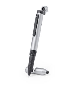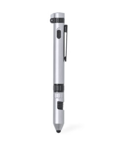 Handlicher Multifunktionsstift mit 7 Verwendungsmöglichkeiten. Lieferumfang: Handyhalter, Stylus, blauer Tintenstift, Taschenlampe mit Knopfzellenbatterie (im Lieferumfang enthalten), Kompass, Flach- und Kreuzschlitzschraubendreher. Einzeln präsentiert in einer Kraft-Design-Box.