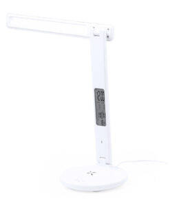 All-in-one-Multifunktions-Klappleuchte aus widerstandsfähigem weißem ABS mit Kunstlederoberfläche. Ausgestattet mit 60 LEDs und 3 Beleuchtungspositionen (warm, kalt und mittel), mit einstellbarer Lichtintensität über die Berührungstaste an der Basis. Ausziehbar und leicht zu positionieren, mit integriertem und hinterleuchtetem LCD-Display, das Uhrzeit, Datum, Tag und Temperatur anzeigt. Mit Einstelltasten auf der Rückseite und Knopfbatterie zur Datenspeicherung.Enthält ein in die Basis integriertes kabelloses 10-W-Ladegerät mit Typ-C-Eingang, das mit kabellos aufladbaren Mobilgeräten kompatibel ist. Mit Typ-C-Ladekabel und Bedienungsanleitung in Englisch und Spanisch. Präsentiert in einer attraktiven Kraft-Design-Box.