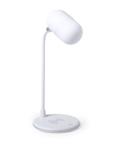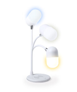 Multifunktionelle All-in-One-Lampe in weißer Ausführung. Mit integriertem Bluetooth®-Lautsprecher und kabelloser Ladestation. 14 LED-Leuchten und 3 Beleuchtungspositionen (warm, kalt und mittel), höhenverstellbar. Kompatibel mit Geräten mit kabelloser Ladetechnologie, mit Micro-USB-Ladekabel und präsentiert in einer attraktiven Designbox.