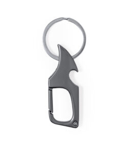 Praktischer Metallöffner mit Schlüsselring und Karabiner zur schnellen Befestigung. Mit Flaschenöffner an einem Ende und einem kleinen Edelstahlmesser am anderen Ende, ideal zum Öffnen von Briefen, Paketen … In einer eleganten metallischen schwarzen Farbe und präsentiert in einer recycelten Papiertüte.