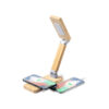 Multifunktionsuhr mit hintergrundbeleuchtetem Touchscreen und integriertem 15-W-Wireless-Ladegerät, mit USB-Ausgang (5 V DC 2 A). Zusammenklappbar und aus Bambus gefertigt, mit Datums-/Uhrzeit- und Alarmfunktionen. Lampe mit 16 LEDs und 3 Leuchtpositionen, mit einstellbarer Lichtintensität. Ladekabel vom Typ C im Lieferumfang enthalten und kompatibel mit Geräten, die mit der kabellosen Qi-Ladetechnologie ausgestattet sind. Präsentiert in einer individuellen Kraftpapier-Designbox, mit Bedienungsanleitung in Englisch und Spanisch. Hergestellt nach RoHS-Standards und unter Einhaltung der folgenden Sicherheitsanforderungen: Überhitzungsschutzsystem. Überladeschutzsystem. Blockiersystem zur Vermeidung von Kurzschlüssen.