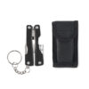 Multifunktionsmesser aus Edelstahl. 10 Funktionen und ausklappbare Taschenlampe. Im Etui aus 600D Polyester. Inkl. 3 AG3-Knopfzellen.