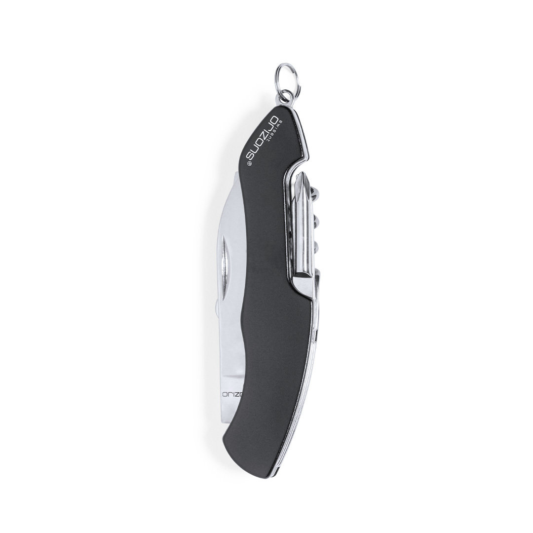 Vielseitig verwendbares Taschenmesser von Orizons mit 10 Edelstahl-Funktionen und Aluminiumgriff in lebendigen Farben. Mit Messer, Schere, Dosenöffner, Flaschenöffner mit Schlitzschraubendreher, Kreuzschraubendreher, Schlagdorn mit Feile und Korkenzieher. Mit Schlüsselring. Präsentiert in einer attraktiven Designbox mit dem Markenlogo.