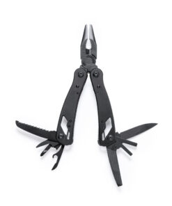 Multitool mit Zubehör aus rostfreiem Stahl mit schwarzem Finish und passendem, widerstandsfähigem Aluminiumgriff. Mit 13 Funktionen, darunter Messer, Schraubendreher, Feile, Öffner und Zange. Zusammenklappbar und kompakt in der Größe, präsentiert in einer individuellen Box in schwarzem Design.