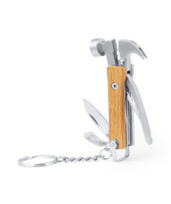 Praktischer Multi-Tool-Schlüsselanhänger aus robustem Edelstahl und Holz. Mit 7 Funktionen: Hammer, kleiner Schlitzschraubendreher, Zange, Messer, Abisolierzange, Feile und Flaschenöffner. Präsentiert in einer individuellen Kraft-Design-Box.