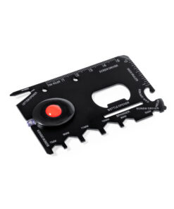 Handliches Multitool aus Edelstahl und schwarz lackiert. Flaches, kartenförmiges Design mit 16 Funktionen: Schlitzschraubendreher, Brieföffner, Lineal in cm und Zoll, Flaschenöffner, Dosenöffner, Schäler, Schraubenschlüssel für Sechskantmuttern in verschiedenen Größen und Taschenlampe (Knopfbatterie im Lieferumfang enthalten). Präsentiert in einer individuellen Tasche aus Recyclingpapier.