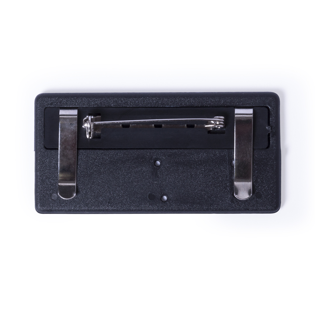 Namensschild in glänzender Ausführung. Rückseite mit doppeltem Befestigungssystem – Metallklammern und Sicherheitsstift – für sichere Justierung.