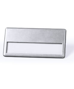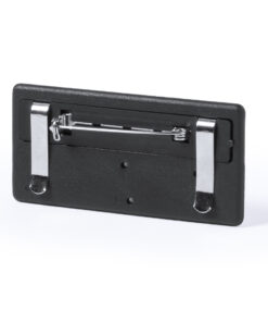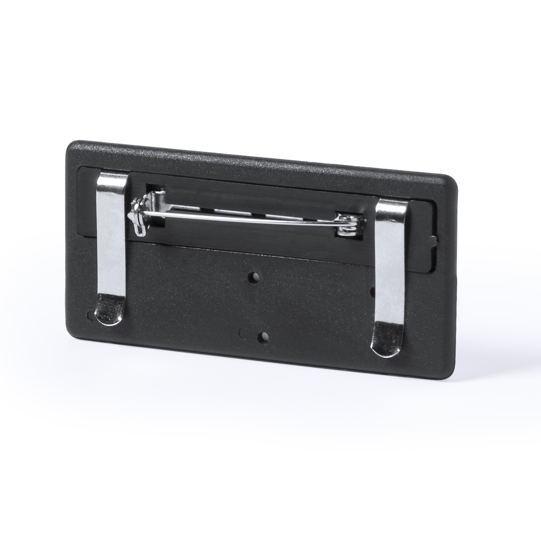 Namensschild in glänzender Ausführung. Rückseite mit doppeltem Befestigungssystem – Metallklammern und Sicherheitsstift – für sichere Justierung.
