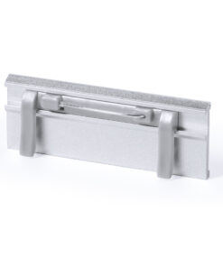 Ausweishalter mit Aluminiumrahmen in eloxierter Ausführung. Mit Sicherheitsnadel auf der Rückseite für sichere Befestigung.