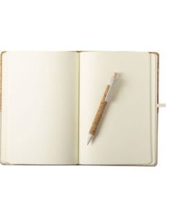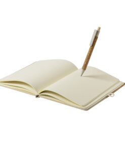 Notizblock mit Kugelschreiber aus unserer Naturlinie. Notizbuch mit festem Einband aus Naturkork und Baumwolle, mit Kugelschreiberhalter und 80 einfachen Blättern. Kugelschreiber mit Push-up-Mechanismus, mit Korkkörper aus Naturkork und Zubehör aus Weizenstroh, um die Verwendung natürlicher Rohstoffe zu fördern und die Schadstoffemissionen zu reduzieren. Schwarze Tinte.