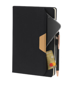 Notizblock aus RPET, mit einer Außentasche mit hervorgehobenem Detail aus braunem PU. Enthält 80 Blätter in cremefarbener gestreifter Ausführung und ein elastisches Halter für einen Stift. Enthält RPET-Kennzeichnung.Das RPET-Material wird aus recyceltem Kunststoff hergestellt, um die Wiederverwendung von Plastikabfällen zu fördern und zur Nachhaltigkeit des Planeten beizutragen.