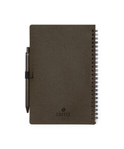 Set aus Notizbuch und Stift. Ringnotizbuch mit Einband aus weicher Kaffeefaser und Stifthalter. Mit 80 Blättern im Öko-Design und einstreifigem Layout. Kugelschreiber mit Druckknopfmechanik, Schaft aus Kaffeefasern und blauer Tinte. Inklusive Kaffeefaserabzeichen auf Block und Stift. Präsentiert in einer individuellen, recycelten Tasche.Die Kaffeefasern werden aus den bei der Kaffeeproduktion anfallenden Abfällen hergestellt. Eine nachhaltige Alternative, die dazu beiträgt, die Verwendung von Kunststoffen zu reduzieren, Energie im Herstellungsprozess zu sparen und so den Umweltschutz zu fördern.