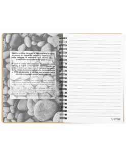 Notizbuch mit doppelten Metallringen und weichem Kartoneinband, mit Blättern aus Steinextrakten. 70 weiße und linierte Blätter, mit eleganter naturfarbener Oberfläche. Logo von Natural Stone auf jedem Blatt. Mit einem Innenblatt, das den Herstellungsprozess aus Steinextrakten erklärt.Das für die Herstellung des Notizbuchs verwendete Material ist zu 100 % recycelbar und chlorfrei, es ist wasserfest, sehr widerstandsfähig und abwaschbar. Es ist somit eine ökologische und nachhaltige Alternative zu konventionellem Papier, das weder traditionell noch von Bäumen stammt.