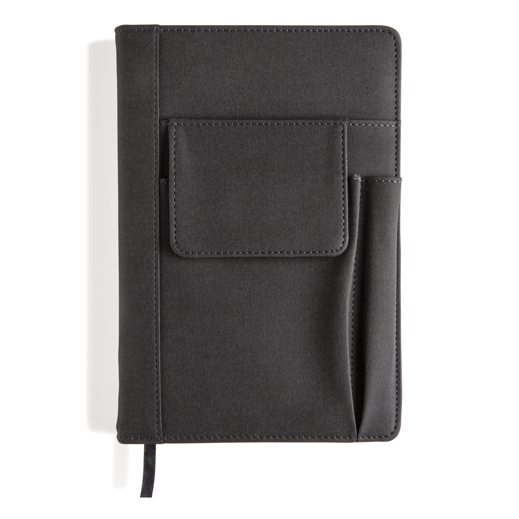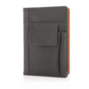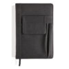Beschichtetes PU Notizbuch mit Telefontasche (14 x 10 cm), Stifthalter und Hauptfach für z.B. eine Powerbank oder Visitenkarten. Schwarzer Seitenteiler und 160 linierten Seiten aus 80g/m2. Mit neuem A5 Notizbuch kann das Cover stets wiederverwendet werden.