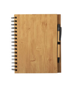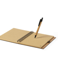 Notizbuch mit Kugelschreiber aus unserer Naturlinie. Ringbuch mit hartem Einband aus Bambus, einschließlich eines Kugelschreiberhalters und 80 Blatt mit gestreiftem Layout im Öko-Design. Kugelschreiber mit Push-up-Mechanismus, mit Bambusgehäuse und schwarzer Tinte.