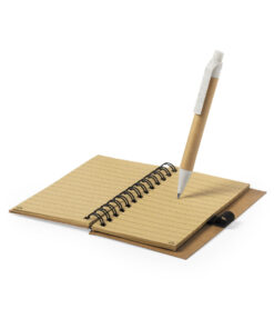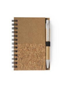 Notizbuch und Kugelschreiber Set aus unserer Naturlinie. Ringbuch mit festem Einband aus Naturkork und recyceltem Karton, mit 80 Blättern im Streifen-Layout und Öko-Design. Kugelschreiber mit Druckmechanik, mit Korpus aus recycelter Pappe und Zubehör aus Weizenstroh, um die Verwendung natürlicher Rohstoffe zu fördern und Schadstoffemissionen zu reduzieren. Blaue Tinte.