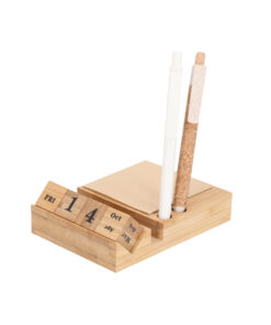 Perpetueller Kalender-Notizblockhalter aus Bambus. Dieser elegante perpetuelle Kalender verfügt über Würfel, die die Wochentage, Monate und Tage des Monats anzeigen. Er enthält einen Smartphone-Halter, 100 Haftnotizen aus Kraftpapier und Steckplätze für zwei Stifte. Perfekt, um Ihren Schreibtisch organisiert und stilvoll zu halten.Materialien wie Bambus fördern die Verwendung natürlicher Rohstoffe und reduzieren somit die Schadstoffemissionen. Es stammt von einer sehr widerstandsfähigen und vielseitigen Pflanze mit schnellem Wachstum und Regeneration, was es zu einer hervorragenden Alternative zur Verwendung von traditionellem Holz macht.