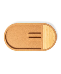 Kabelloser Organizer-Ladegerät mit 15W Leistung. Die Basis besteht aus Naturkork und die Ladefläche aus Bambus. Es verfügt über eine integrierte Smartphone-Halterung und Stauraum für Büroartikel. Es ist kompatibel mit Geräten mit Qi kabelloser Ladetechnologie, hat eine LED-Ladeanzeige und ein Typ-C-Ladekabel ist im Lieferumfang enthalten. Die Basis ist rutschfest und wird in einer individuellen Kraft-Design-Box mit Anleitung in Spanisch und Englisch geliefert.