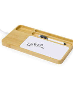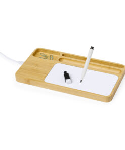Natur Linie Kabelloses Organizer-Ladegerät 15W. Smartphone-Haltefunktion und extra Staufach, mit integriertem Memo-Board und schwarzem Tintenmarker mit Radiergummi in der Haube. Große Branding-Fläche und präsentiert in einer individuellen Ökodesign-Box aus Kraftkarton. Gebrauchsanweisung in Englisch und Spanisch.Materialien wie Bambus fördern die Verwendung von natürlichen Rohstoffen und reduzieren die Schadstoffemissionen. Es handelt sich um eine sehr widerstandsfähige und vielseitige Pflanze, die schnell wächst und sich regeneriert, was sie zu einer hervorragenden Alternative zu herkömmlichem Holz macht.Hergestellt gemäß den RoHS-Normen und unter Einhaltung der folgenden Sicherheitsanforderungen:Überhitzungsschutzsystem.Überladungsschutzsystem.Blockiersystem zur Vermeidung von Kurzschlüssen.