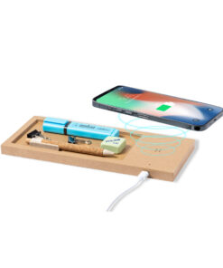 10-W-Organizer für kabellose Ladegeräte aus recyceltem Karton mit Stauraum für Schreibwaren. Kompatibel mit Geräten, die mit der kabellosen Qi-Ladetechnologie ausgestattet sind, mit LED-Ladestatusanzeige und Typ-C-Ladekabel im Lieferumfang enthalten. Präsentiert in einer individuellen Kraftpapier-Designbox, mit Bedienungsanleitung in Englisch und Spanisch. Hergestellt nach RoHS-Standards und unter Einhaltung der folgenden Sicherheitsanforderungen: Überhitzungsschutzsystem. Überladeschutzsystem. Blockiersystem zur Vermeidung von Kurzschlüssen.