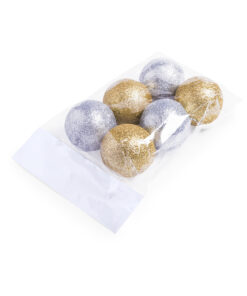 Set aus 6 Weihnachtskugeln zum Aufhängen in verschiedenen kräftigen Metallic-Farben. Präsentiert in einem individuellen Beutelchen mit weißer Druckfläche.