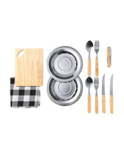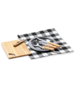 Originelles Picknick-Set für 2 Personen. Präsentiert in einer robusten Tasche aus Baumwolle mit natürlichem Finish, Reißverschluss und Tragegriff. Verstärkter Innenraum, mit Fächern für verschiedenes Zubehör. Inhalt: 2 Löffel, 2 Messer und 2 Gabeln aus rostfreiem Stahl mit Naturholzgriff. 2 Teller aus rostfreiem Stahl mit einem Durchmesser von 19,5 cm. 2 Stoffservietten 30 x 30 cm. Mit Retro-Design im Karomuster und in Kombination von Schwarz-, Grau- und Weißtönen. Korkenzieher aus Edelstahl mit integriertem Messer und Naturholzgriff. Schneide- und Präsentationsbrett 15 x 15 cm, aus Naturholz und mit gestanztem Griff.