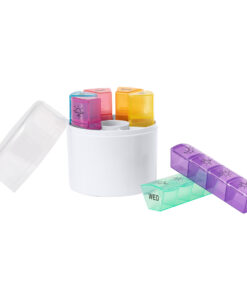 Kompakte wöchentliche Pillendose. Mit 7 Fächern, unterteilt nach Farben und Akronymen, um den Wochentag schnell zu identifizieren. Jedes Fach ist für jeden Teil des Tages in 4 unabhängige Zellen unterteilt. Präsentiert in einer einzelnen recycelten Tasche.